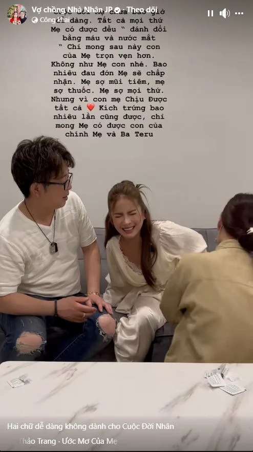 Cô còn lên clip chia sẻ mình và chồng sẽ quyết định chuyển sang điều trị với bác sĩ khác: "Bác sĩ từng khiến Nhân 2 lần thất vọng thì Nhân không thể đồng hành nữa. Lần trước Nhân đã hoan hỉ bỏ qua vì nghe đồn bác sĩ này mát tay, Nhân chỉ mong bác có thể giúp Nhân có 1 đứa con. Nhưng lần này Nhân thấy có lẽ tâm đức của bác không dành cho Nhân".