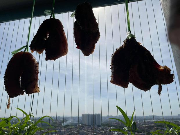Nhà em ban công hướng Đông, nắng từ 5h đến 10h nên sau 1 đêm ướp là sáng hôm sau chồng em dậy thật sớm, treo thịt lên với ánh mắt đầy hy vọng!