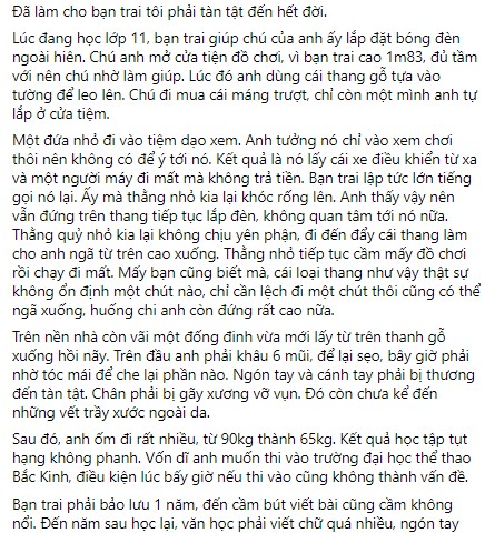 Theo những gì cô gái chia sẻ, vào năm bạn trai cô học lớp 11, thì một lần được chú của anh ấy nhờ lắp đặt hộ bóng đèn ngoài hiên cửa hàng đồ chơi. Cũng bởi có lợi thế về chiều cao (chàng trai cao 1m83), nên anh đồng ý không suy nghĩ.