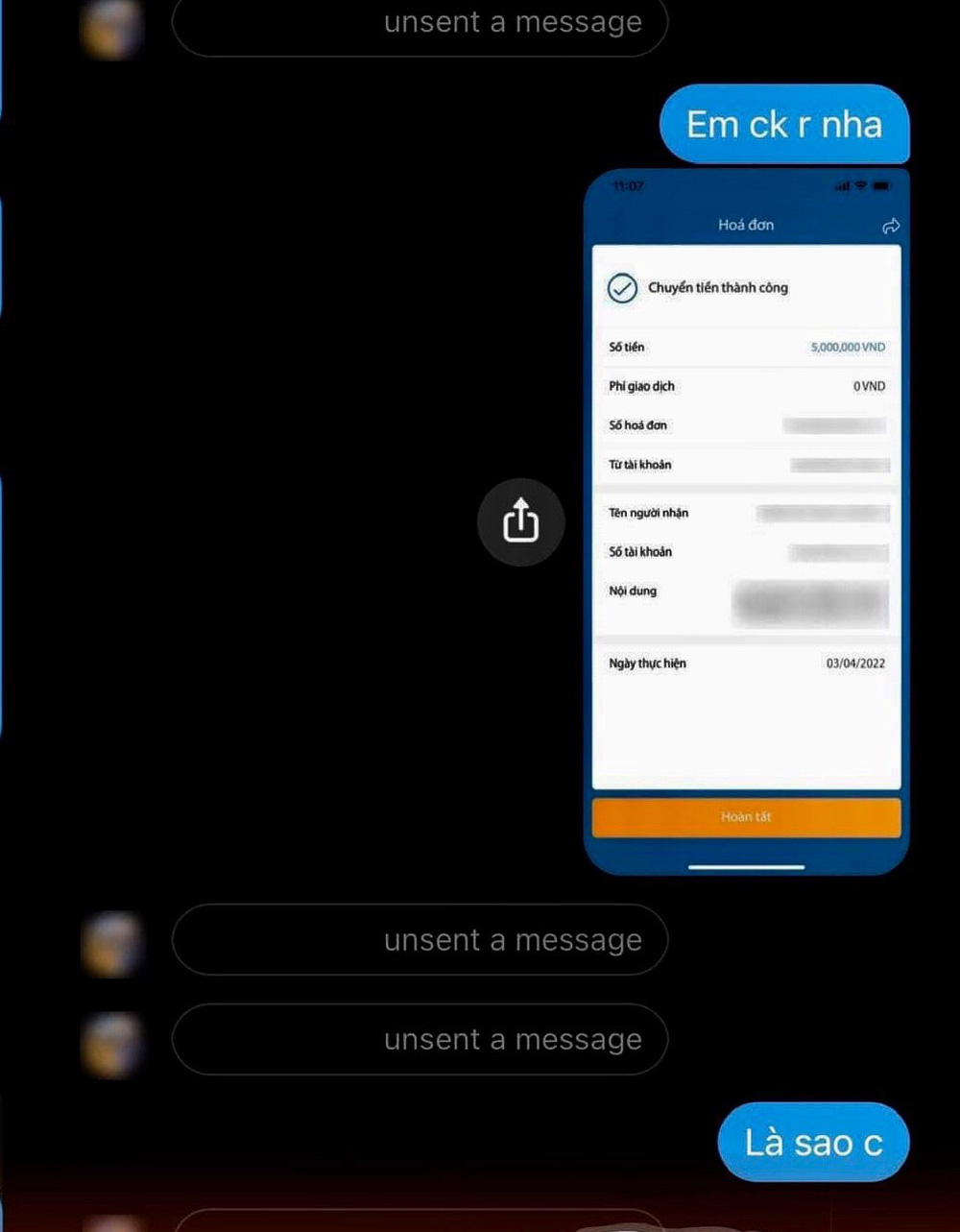 Sau khi chị gửi mình số tài khoản, mình copy nguyên dãy số ấy và chuyển đi, khi gửi thì tiền vẫn đi bình thường. Sau khi mình gửi lại bill thì chị ấy mới tá hỏa nói rằng mình chuyển nhầm số tài khoản rồi.