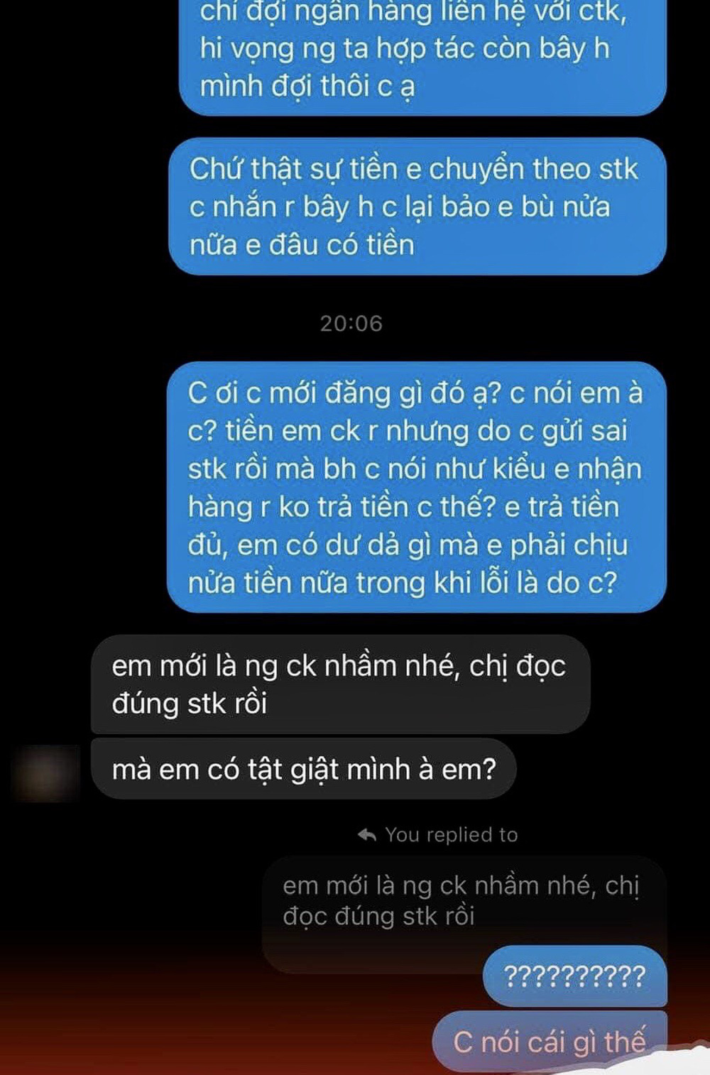 - Gửi sai số tài khoản là trách nhiệm thuộc về chủ shop rồi. Sai thì nhận, không có lòng vòng. Tiền của mình còn không kiểm tra kỹ thì ai có nhiệm vụ kiểm tra dùm mình. Món đồ 5 triệu chứ 50 triệu không lẽ bắt người ta bù 25 triệu à? Nếu chủ shop là người mua hàng thì chủ shop có đền không? Vô lý thế cũng nghĩ ra được. Trước mình cũng đưa sai số tài khoản và khách ngỏ ý hỗ trợ, nhưng do mình sai nên cảm ơn khách và tự chịu trách nhiệm đấy.