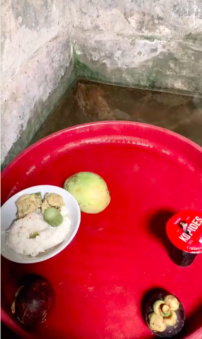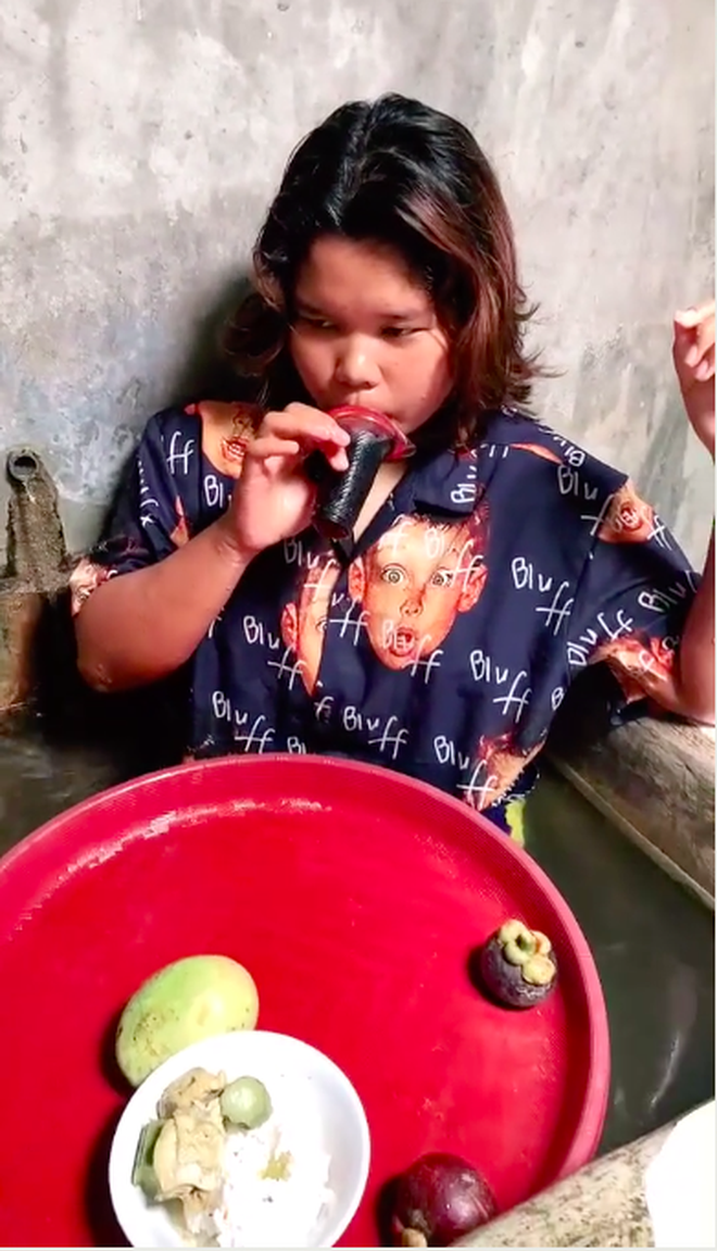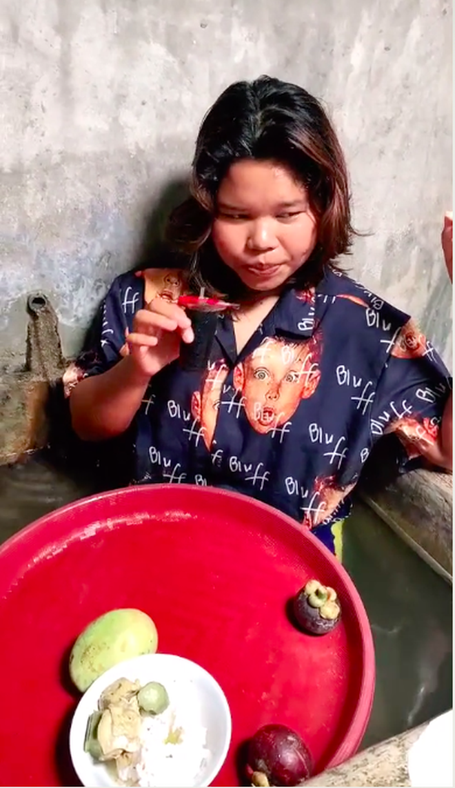 Theo đó, cô ngồi trong một bể nước nhìn khá cũ kỹ và chật hẹp ở nhà mình, trên mặt nước bày một cái mâm màu đỏ đựng đầy nào là xoài, măng cụt, 1 tô cơm và ly nước gì đó. Biểu cảm "hưởng thụ" sau đó càng khiến dân mạng không nhịn được cười.