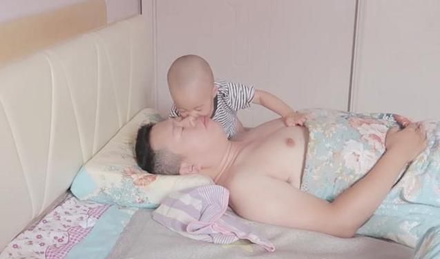 Ban đầu, cậu bé dùng tay vỗ vào vai bố rồi chọc vào nách bố, ngoáy tai bố, bố cũng chỉ trở mình một chút rồi say sưa ngủ tiếp. Cậu bé lăn lộn trườn qua người bố, bố vẫn chẳng xi nhê gì, thậm chí bé lấy cả chân đạp vào mặt bố, bố vẫn ngủ ngon lành.