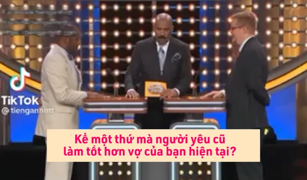 Cụ thể, ở chương trình Family Feud (bản Việt có tên gọi là: Chung Sức), MC của chương trình là Steve Harvey đã ra câu hỏi "cực căng" cho 2 anh chồng rằng: Kể một thứ mà người yêu cũ làm tốt hơn vợ của bạn hiện tại? Hai bà vợ cũng là thành viên đội chơi ở phía dưới "nín thở" đợi xem ai sẽ bấm chuông giành quyền trả lời trước.