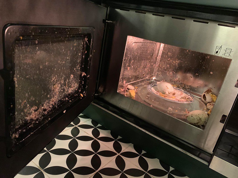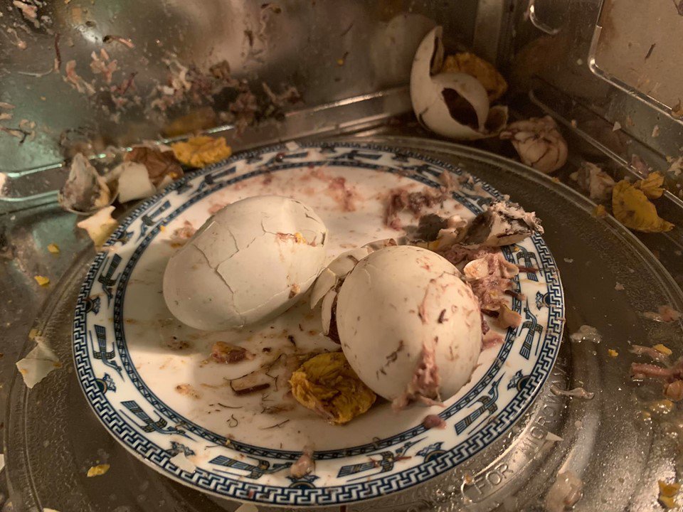Trứng vịt lộn sống bị bổ bắn tung tóe khi cho vào lò vi sóng (Ảnh: facebook Phương Hồng)