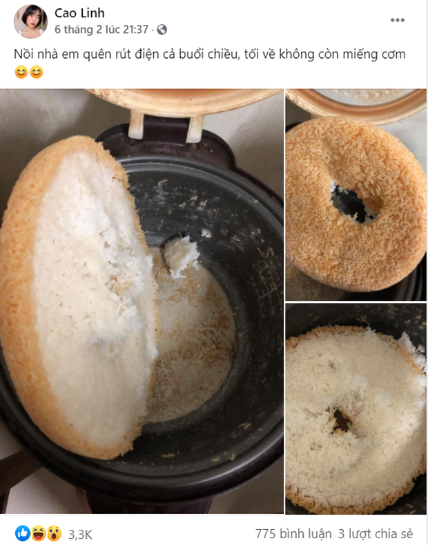 Mới đây, một cô nàng đã đăng vào group “Ghét bếp, không nghiện nhà” bức ảnh chụp lại kết quả của việc đãng trí quên rút dây cắm nồi cơm điện. “Nồi nhà em quên rút điện cả buổi chiều, tối về không còn miếng cơm” khiến dân tình cười ngất. Lại thêm 1 tác phẩm để đời của hội gái đoảng đây mà!
