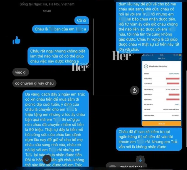Em hỏi tới thì em ấy bảo chưa nhận được nên vay tiền bạn để trả rồi nhưng cũng không đòi xin em thêm. Sau đó em cố gắng liên lạc mà người yêu cũng không chịu bắt máy.