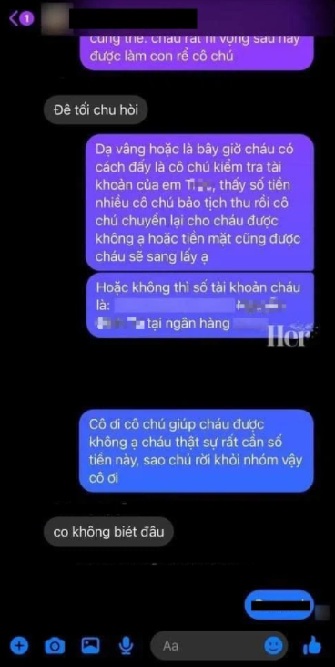 Em cũng nịnh nọt một chút lấy lòng rồi thả lại số tài khoản của em thì ông bố thoát luôn nhóm, bà mẹ thì bảo cô không biết đâu.