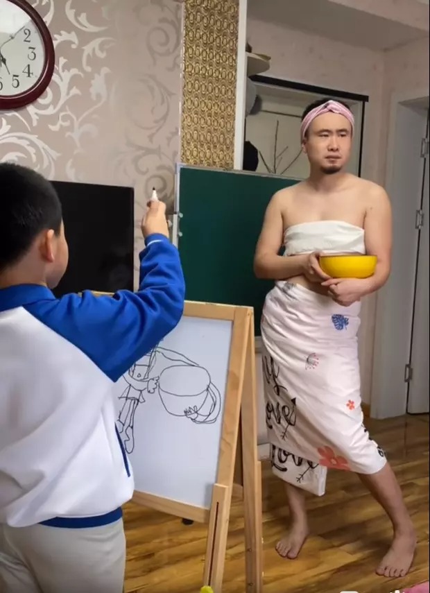 Điển hình như mới đây, một ông bố cam chịu gạt bỏ hết liêm sỉ lẫn hình tượng để làm vui lòng cậu con trai. Cụ thể trong đoạn video, ông bố này đã trút bỏ vẻ ngoài nam tính để quấn chăn làm váy, đeo bờm, cầm tô... làm một cô gái làm mẫu ảnh cho con trai vẽ tranh.