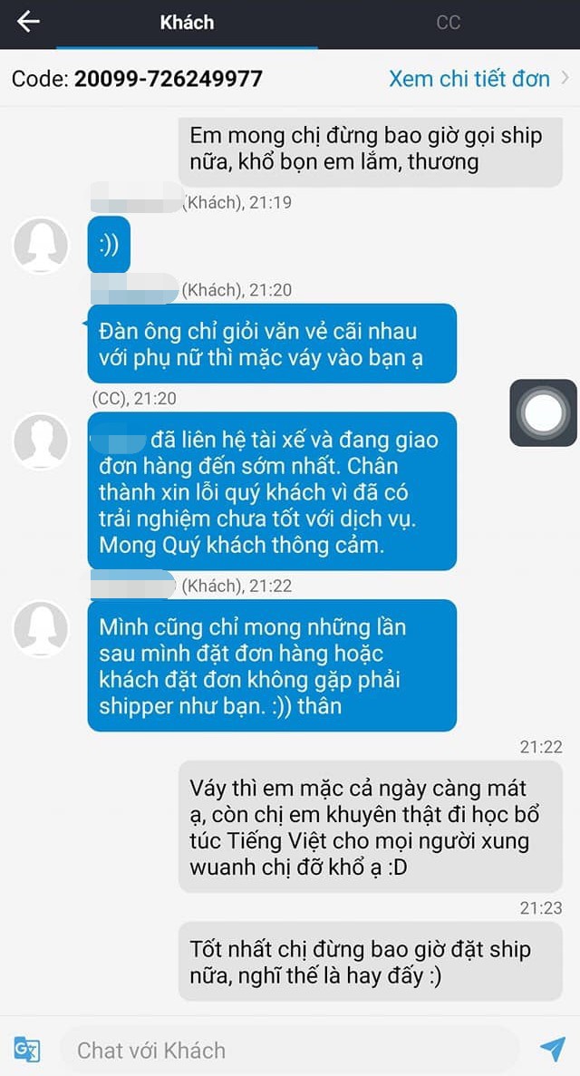 Ủa. Chứ em đi cái đường ở Hà Đông vào lúc 9 - 10h đêm, đường thì không có đèn? Đường đất? Em lặn lội 5km cái đường đấy không đáng 21.000 VNĐ của chị ạ? Xong chị bảo chị bom? Em cầu xin chị lấy hàng giúp nhưng bom thì vẫn nổ to trên đầu em. Xong chị nhắn tin lại giống như là em sai ạ? Em là người bắt chị phải bom em dù chị không muốn ạ? Chị còn bảo gọi điện cãi nhau để làm gì? Chị nghĩ em giống chị ạ? Ảnh ở dưới, mọi người đọc xong cho em xin được hỏi là em SAI à?"