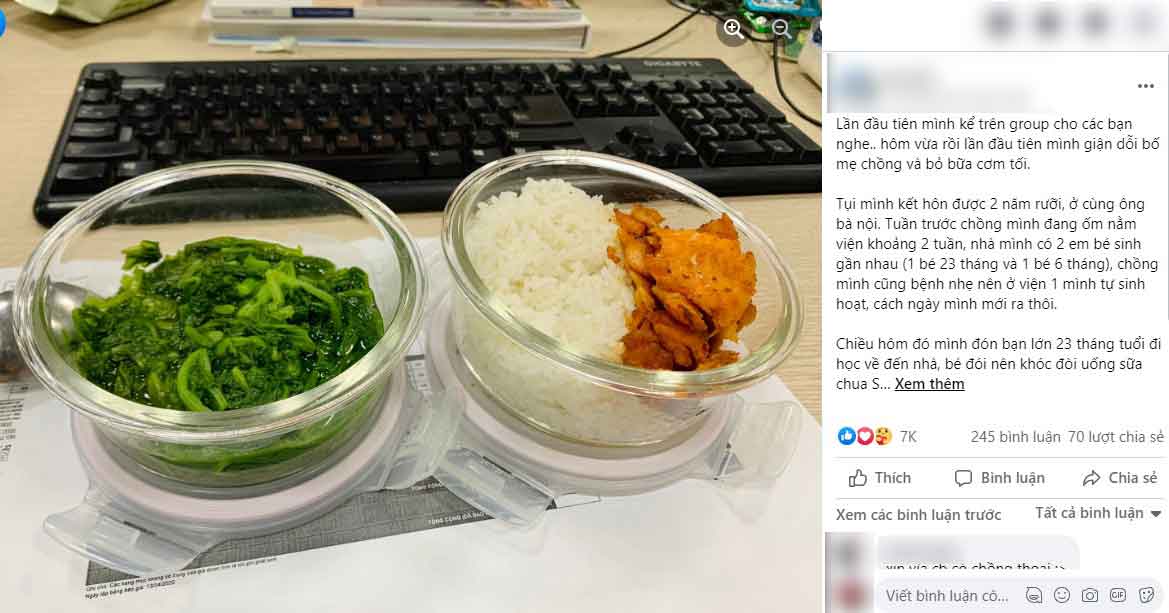 Cô kể tiếp: "Mình bế bạn nhỏ 6 tháng vào phòng đi ngủ, lúc ấy 7h tối. Mẹ chồng mình vào bảo: 'Thôi con cứ ra ngoài ăn lấy 1 ít, không ăn nhiều thì ăn ít'. Mình không ăn.