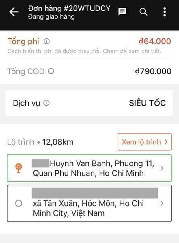Theo chia sẻ từ nam shipper tên L.Nhân trên mạng xã hội, hôm 26/9 thông qua ứng dụng giao hàng anh có nhận vận chuyển 2 chiếc bánh ngọt từ tiệm bánh K. trên đường Huỳnh Văn Bánh đến huyện Hóc Môn (TP.HCM), đã ứng trước 790k giá trị đơn hàng thay cho khách. Sau quãng đường hơn 12km và hàng chục phút di chuyển, chiếc bánh khi đến Hóc Môn bị tan chảy lớp kem phô mai khiến hình thù "biến dạng", do vậy khách đã từ chối nhận bánh.