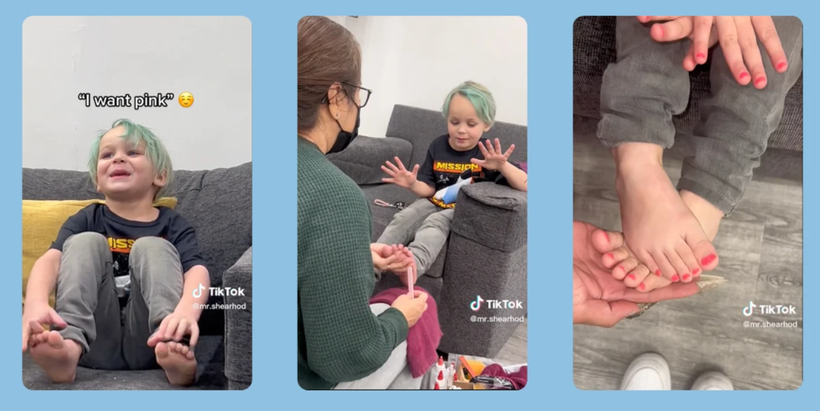 Cậu bé hét lên: “Con muốn màu hồng!” trước khi ngồi xuống và được chăm sóc toàn bộ móng tay và móng chân. Cuối clip, cậu bé khoe bộ móng tay được sơn sửa màu hồng rực rỡ.