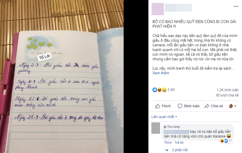 "Chả hiểu sao dạo này tiền quỹ đen quỹ đỏ của mình giấu ở đâu cũng mất hết, trong nhà thì không có camera, mỗi lần giấu tiền vợ toàn không ở nhà, loanh quanh chỉ có mỗi hai bố con. Mà phải nói thật, con mình nó ngoan, kể cả nó thấy bố giấu tiền nhưng cấm bao giờ thấy nó nói với mẹ nó nửa lời.