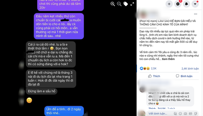 Đọc xong ai cũng tỏ ra bức xúc vì sự không thấu hiểu của cô gái trẻ. Tình hình kinh tế bạn trai khó khăn do dịch, cô không thèm thông cảm mà vẫn đòi hỏi đủ điều. Anh bạn trai có lẽ phải vất vả lắm mới “mặc cả” ngày đi chơi xuống thấp. Chẳng phải anh không muốn mà tình hình kinh tế quyết định tất cả.