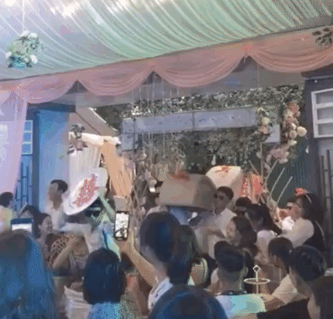 Điển hình như mới đây, trên MXH lan truyền một đoạn clip ghi lại cảnh trong một tiệc đám cưới. Trong sự bất ngờ và thích thú của quan khách, hội bạn thân "lầy lội" gồm chục thanh niên hí hửng bê nguyên một chiếc "ghế tình yêu" vào làm quà tặng cho cô dâu chú rể. Thậm chí, cả nhóm còn mang theo kiểu vác trên vai nổi tiếng trên TikTok với nền nhạc Astronomia từng khuynh đảo MXH hồi giữa năm nay.