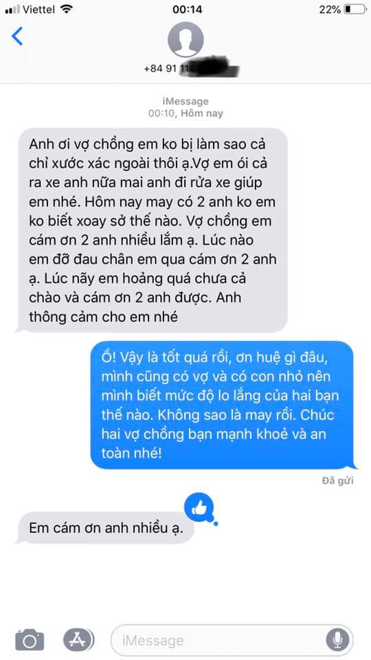 0h khuya nhận được tin nhắn của người chồng thông báo vợ không sao cả là mừng quá rồi. Cảm ơn tất cả và chúc mọi người lái xe an toàn!