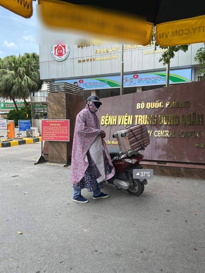 Dù thời tiết thủ đô đang chạm ngưỡng hơn 40 độ, nắng cháy da cháy thịt nhưng anh vẫn không ngại mặc một chiếc áo mưa dày, đứng đợi vợ ngoài cổng.