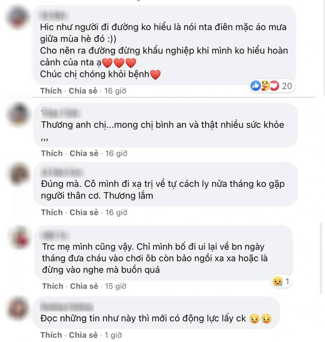 "Mình từng đi xạ trị nên biết. Phải kiêng khem nhiều thứ, cách ly con cái, gia đình không dám lại gần. Chúc chị sớm khỏi bệnh".