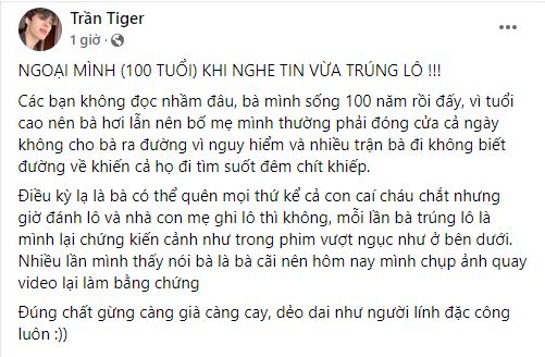 Nguyên văn dòng chia sẻ của cô cháu gái: "Các bạn không đọc nhầm đâu, bà mình sống 100 năm rồi đấy, vì tuổi cao nên bà hơi lẫn nên bố mẹ mình thường phải đóng cửa cả ngày không cho bà ra đường vì nguy hiểm và nhiều trận bà đi không biết đường về khiến cả họ đi tìm suốt đêm chít khiếp.