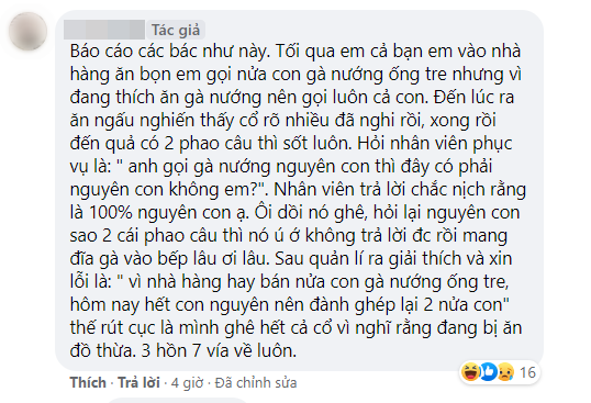 "Tối qua em cả bạn em vào nhà hàng ăn, bọn em gọi nửa con gà nướng ống tre nhưng vì đang thích ăn gà nướng nên gọi luôn cả con. Đến lúc ra ăn ngấu nghiến thấy cổ rõ nhiều đã nghi rồi, xong rồi đến quả có 2 phao câu thì sốt luôn. Hỏi nhân viên phục vụ là: "Anh gọi gà nướng nguyên con thì đây có phải nguyên con không em?". Nhân viên trả lời chắc nịch rằng là 100% nguyên con ạ.