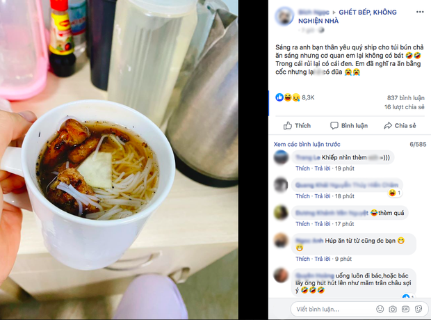 Vẫn là một câu chuyện éo le từ nhóm Ghét bếp, không nghiện nhà đây. Tình huống dưới đây đang thu hút đông đảo sự chú ý của các thành viên. Chuyện là một cô vợ nọ được chồng tâm lý ship cho suất bún chả lên tận cơ quan để ăn sáng, nhưng chẳng hiểu tại sao mà không có bát để ăn. Nhanh trí, cô nàng đã nghĩ ngay ra phương án cho nước mắm và bún chung vào cốc để ăn, cũng may là vừa vặn, sạch sẽ.