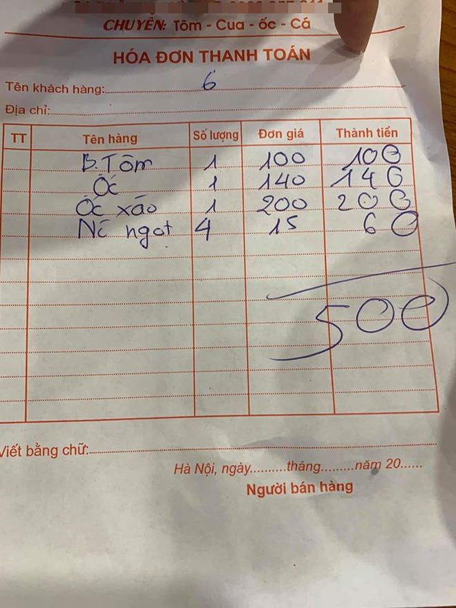 Thế nhưng khi thanh toán, anh chàng được tờ hóa đơn báo giá là 500 nghìn đồng. Món ốc hấp "đội giá" lên 140 nghìn đồng - bằng giá của 2 đĩa.