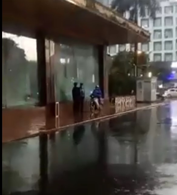 Chưa dừng lại ở đó, cạnh chỗ người phụ nữ đứng trú mưa còn có một người phụ nữ khác cùng con nhỏ đang trú mưa cũng bị người này đuổi ra. Vì lạnh quá, cháu bé liên tục nép vào người mẹ. Nhưng vị bảo vệ này vẫn tiếp tục ép bằng được hai mẹ con di chuyển ra khỏi sảnh bên ngoài tòa nhà.