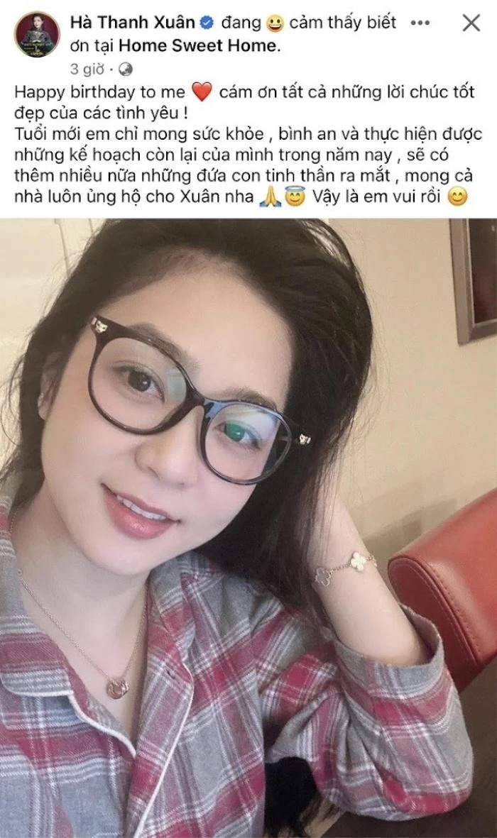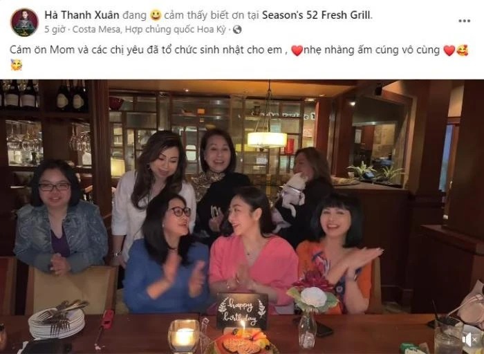 Trong cập nhật mới nhất ở buổi tiệc sinh nhật của mình, Hà Thanh Xuân hạnh phúc gửi lời cảm ơn đến Mẹ và những người chị, người bạn đã tổ chức sinh nhật cho cô. "Cám ơn Mẹ và các chị yêu đã tổ chức sinh nhật cho em, nhẹ nhàng ấm cúng vô cùng", cô viết.
