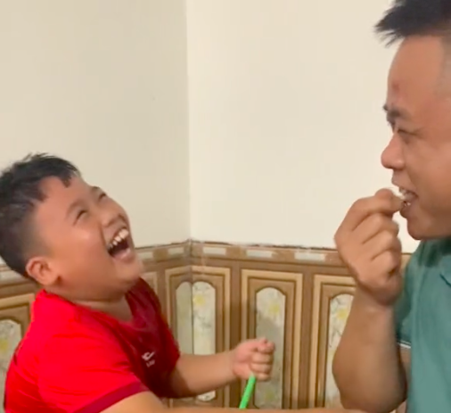 Cậu con trai nhỏ tuổi không thể nhịn nổi đành ôm bố rồi cười một trận quên trời đất. Hai bố con cười đến nỗi không ăn nổi cơm trong khi chị vợ lúc này chỉ ngồi im quay clip trong bất lực.