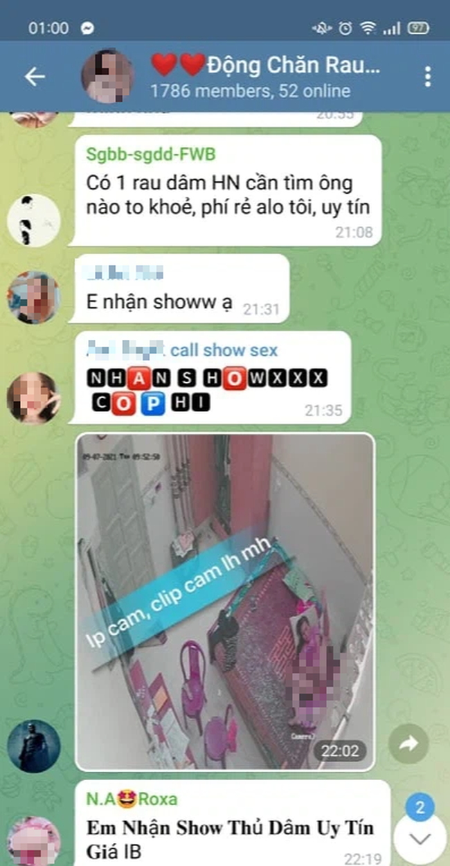 "Các nhóm chat người lớn phổ biến trên telegram như: Lẩu cua, Tâm sự thầm kín, Chăn rau, Tâm sự 18+... đều có số lượng thành viên từ 20.000 đến 50.000 người. Trên đây, các thành viên trong nhóm được thoải mái chia sẻ những bức ảnh nhạy cảm, clip 18+ của các idol phim người lớn hoặc do chính họ quay. Nhưng đa phần đều là bán dâm trá hình nên mình không thích tham gia", Hòa chia sẻ.