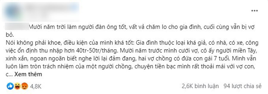 "Mười năm trời làm người đàn ông tốt, vất vả chăm lo cho gia đình, cuối cùng vẫn bị vợ bỏ. Nói không phải khoe, điều kiện của mình khá tốt: Gia đình thuộc loại khá giả, có nhà, có xe, công việc ổn định thu nhập hơn 40 triệu - 50 triệu/tháng. Mười năm trước mình cưới vợ, cô ấy người miền Tây, xinh xắn, ngoan ngoãn biết nghe lời lại đảm đang, hai vợ chồng có đứa con gái 7 tuổi. Mình vẫn luôn làm tròn trách nhiệm của một người chồng, chuyện tiền bạc mình rất thoải mái với vợ con, cuối tuần đưa cả nhà đi ăn uống vui chơi đầy đủ, thế mà bây giờ mình đứng trước nguy cơ li dị.