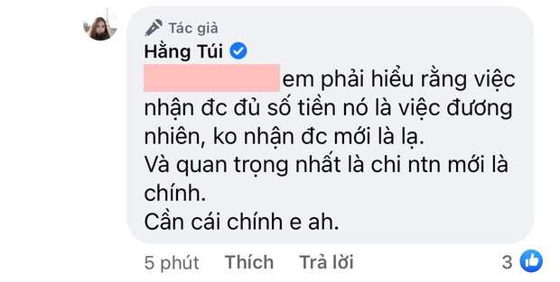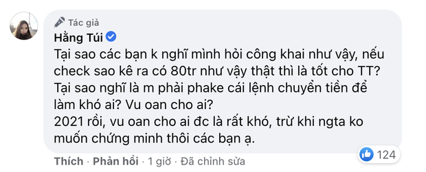 Cụ thể, sau bình luận nhờ cư dân mạng vào cuộc tìm tờ sao kê của Thuỷ Tiên có lệnh chuyển khoản của mình. Nhiều cư dân mạng đã dấy lên tin đồn Hằng Túi cố tình "pha ke" - làm giả ảnh chuyển tiền, đồng thời cho rằng cô đang cố tình "gây ồn ào - thu hút sự chú ý của cư dân mạng". Trước những lời tố đó, Hằng Túi đã đáp trả khá cứng rằng: