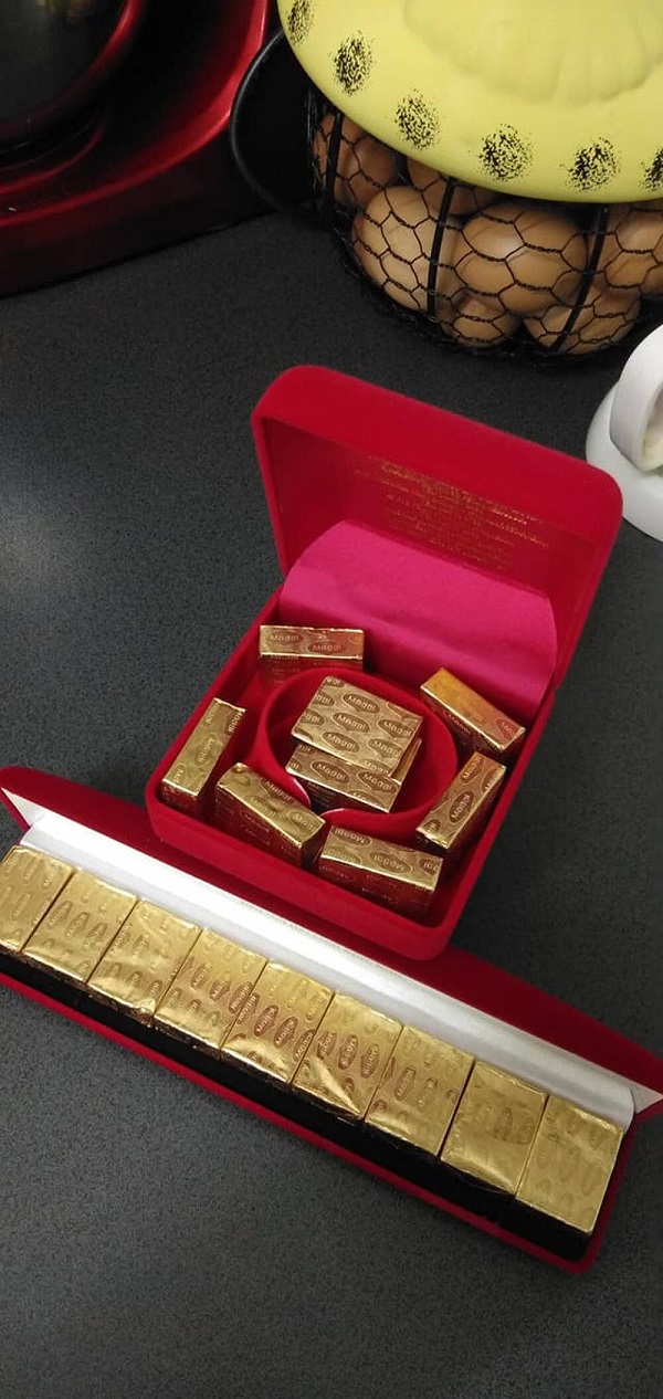 Cụ thể, chị Junariah bất ngờ nhận được những chiếc hộp nhung đỏ từ chồng, bên trong toàn những thỏi vàng sáng bóng. Vui mừng trước món quà của chồng, chị ngay lập tức chia sẻ món quà lên trang Facebook cá nhân với lời nhắn: “Sáng ra, tôi bất ngờ nhận được chiếc hộp màu đỏ đựng đầy vàng thỏi. Người chồng thực sự hiểu được sở thích và gu thẩm mỹ của vợ là đây. Chồng à, em yêu anh”.
