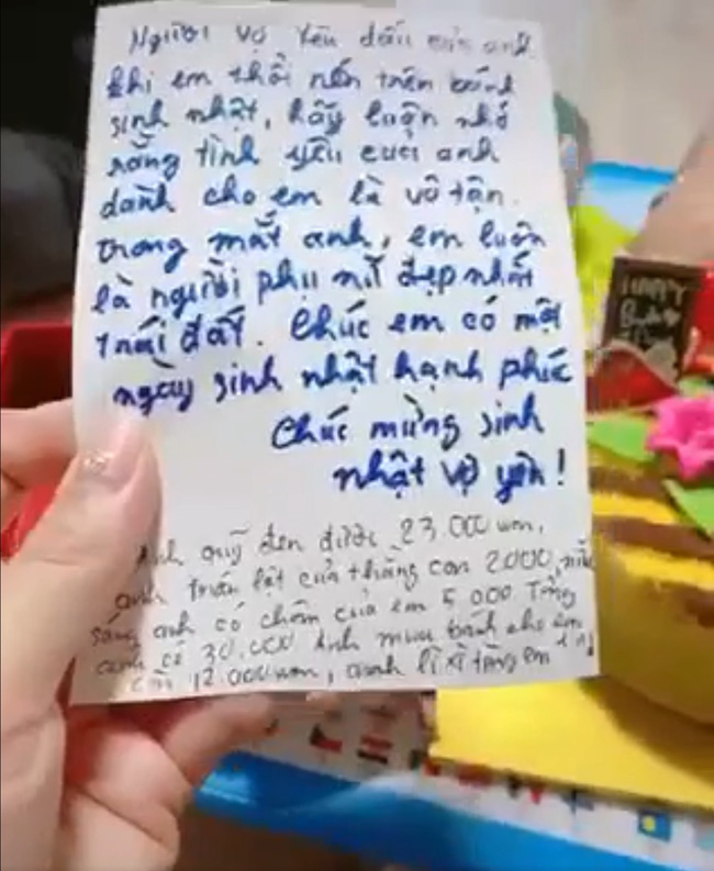 Phía cuối đoạn thư tay chứa những lời nói "ngôn tình" là đoạn bất ngờ nhất khi đức ông chồng tự giác tiết lộ nguyên nhân có chiếc bánh sinh nhật to đùng tặng vợ. Thì ra chiếc bánh được mua bởi số tiền từ quỹ đen của chồng, chút tiền tiết kiệm của con và phần còn lại là "chôm" từ trong ví của vợ. Số tiền mua bánh còn thừa lại được ông chồng cho vào lì xì tặng vợ như một phần "hợp thức hoá" số tiền riêng sang cho vợ.
