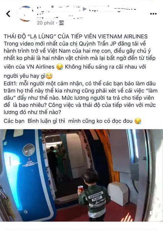 Trong video mới nhất của chị Quỳnh Trần JP đăng tải về hành trình trở lại Việt Nam của hai mẹ con, điều gây chú ý nhất không phải là hai nhân vật chính mà lại bất ngờ đến từ tiếp viên của VN Airlines. Không hiểu sáng ra cãi nhau với người yêu hay gì?" - Một khán giả phát biểu trong hội nhóm nổi tiếng trên mạng xã hội.