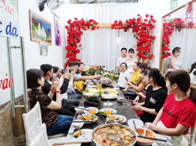 Những hình ảnh được chia sẻ trên Facebook cho thấy cô dâu Thu Sao khá xinh đẹp lộng lẫy trong tiệc kỉ niệm 2 năm cưới chồng trẻ. Cô còn diện hẳn một chiếc váy cưới cầu kỳ trắng tinh, khiến ai cũng nghĩ đây giống tiệc đính hôn hay tiệc cưới hơn là một bữa ăn kỉ niệm. Vợ chồng Thu Sao đầu tư hẳn một chiếc rạp với cổng hoa trang trí rực rỡ cho khách mời thoả thích chụp ảnh.