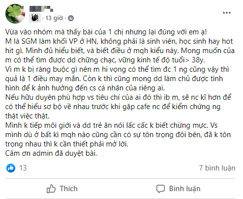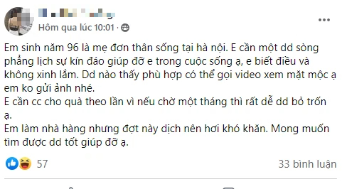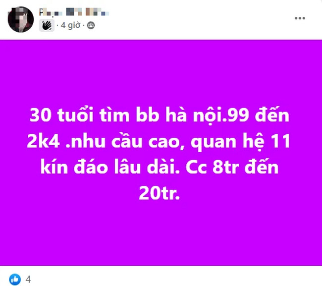 "Tìm 1 daddy ở Hà Nội, baby là mẹ đơn thân, không cần chu cấp theo tháng, chu cấp theo lần mỗi lần 2 - 3 triệu. Yêu cầu tôn trọng, lịch sự và phải dùng bao cao su"....