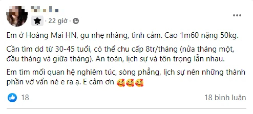 Ví dụ như lời rao này chẳng hạn: "Là mẹ đơn thân tìm daddy ở Hà Nội. Gặp nhau cho quà theo lần ạ. Yêu cầu: Lịch sự, tôn trọng, có thể chu cấp 8-22 triệu/tháng. Mỗi lần 2 triệu".