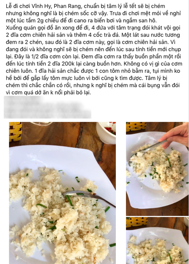 Mới đây, một du khách đã đăng bài "bóc phốt" quán ăn nọ ở Vĩnh Hy (Ninh Thuận) vì "chém" 2 dĩa cơm chiên hải sản với giá 200k nhưng chất lượng thì thực sự tệ hại. Nguyên văn bài chia sẻ như sau: