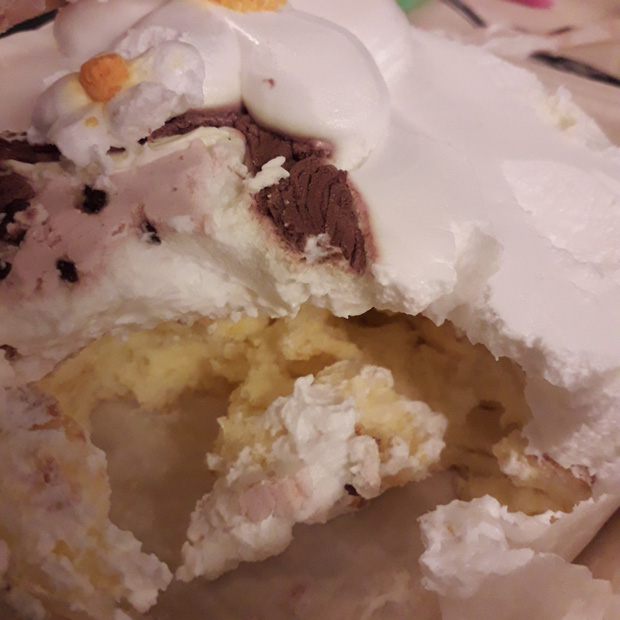 Nhưng mọi chuyện không chỉ dừng ở đó, cô nàng còn cho biết thêm: "Riêng phần ngoại hình đã làm chúng mình cực thất vọng nên chúng mình đã ăn bánh với hy vọng vớt vát được chiếc cốt bánh ngon. Nhưng ôi thôi xắn bánh ra một chút màu vàng hiện lên, cốt chocolate màu vàng chăng? Ăn thử thì mình không thấy được 1 vị gì ngoài vị tanh của trứng. C.H tiết kiệm vanilla đến mức không cho vào chiếc bánh nhỏ 120k ư?"