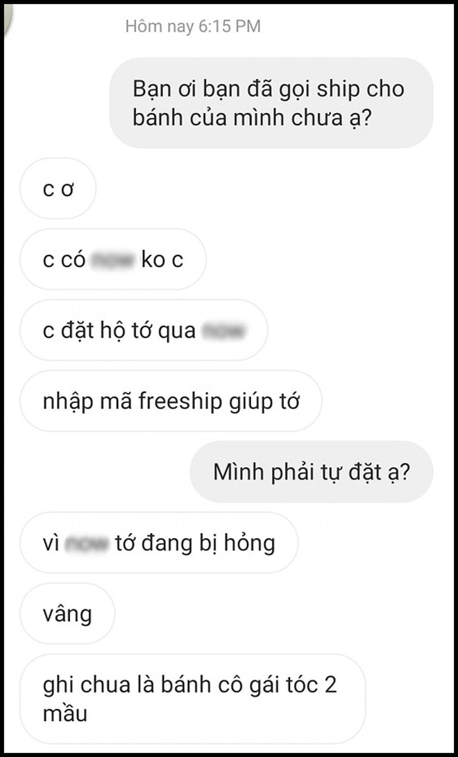 Tuy nhiên đến 6h15 thứ 5, A. vẫn không thấy bánh đâu nên đã nhắn tin hỏi và nhận được câu trả lời "Tớ quên đơn đấy ạ" mà không một lời xin lỗi hay thông cảm. Không những thế phía tiệm bánh còn không tự động giao hàng mà lại đề nghị khách đặt ship vì app đang lỗi.