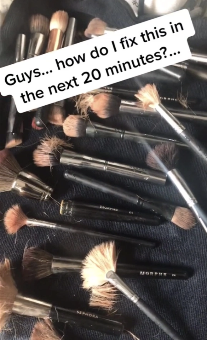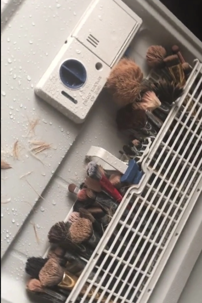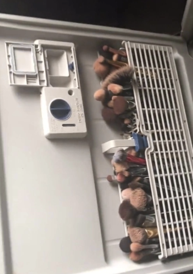 Cụ thể, anh chàng này đã sắp hết cọ trang điểm đắt tiền của vợ và bỏ vào... máy rửa bát để làm sạch một lượt. Thế nhưng, sau khi xong xuôi, thay vì nhận được những chiếc cọ sạch tươm, sáng bóng thì anh chồng vô cùng hốt hoảng khi bộ dụng cụ hành nghề "quý hơn khúc ruột" của vợ đã tan hoang, lớp rụng lớp xác xơ. Biết mình đã gây thảm họa, anh chàng ngay lập tức quay lại và kêu cứu trên TikTok.