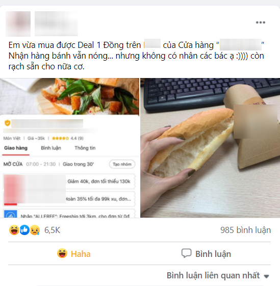 "Em vừa mua được Deal 1 đồng trên app N của cửa hàng B.M.O. Nhận hàng bánh vẫn nóng... nhưng không có nhân các bác ạ, còn rạch sẵn cho nữa cơ" - T.L viết.