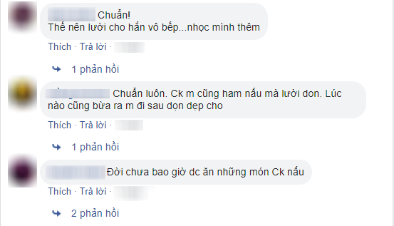 - Thật, để chồng nấu cơm xong nhiều lúc nghĩ thà mình tự nấu cho xong. Tuy có rửa đồ bày ra nhưng không lau chùi gì cả. Rồi đồ không để đúng chỗ, mình lại phải dọn lại.