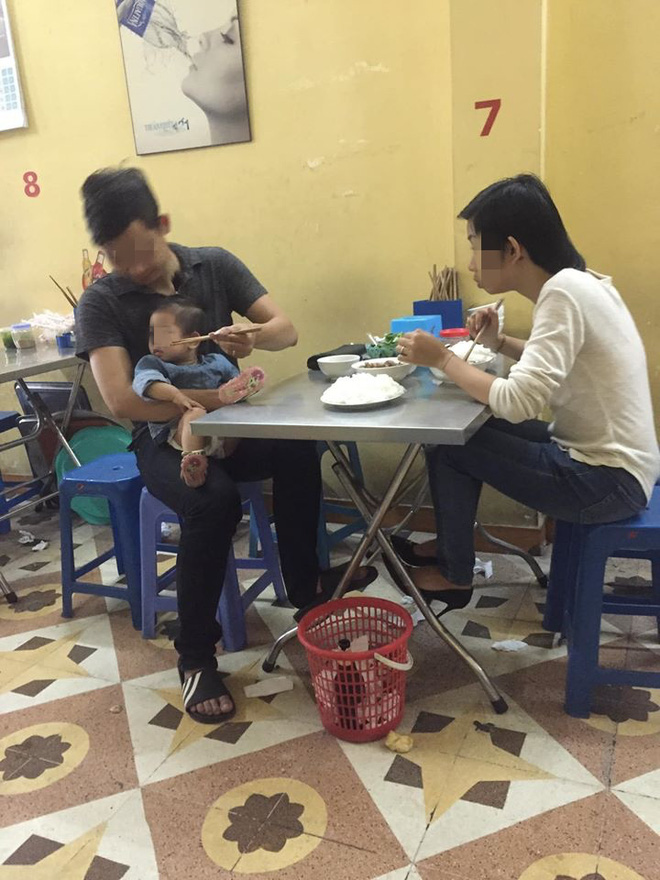 Mình đã từng chứng kiến cảnh một gia đình khác, chồng thảnh thơi ăn sáng, bên cạnh là vợ và 2 đứa con nhỏ. Một đứa chị vợ cắt bánh phở nhỏ cho con tự xúc ăn. Một đứa chị san bát phở của mình cho bé con và xúc từng thìa cho bé.