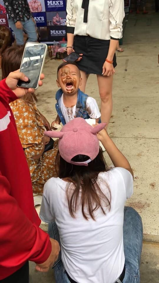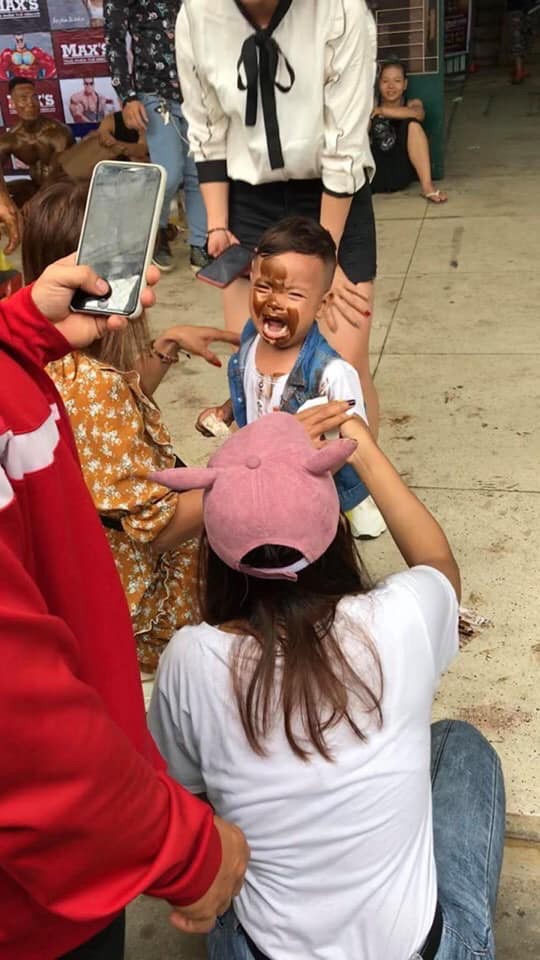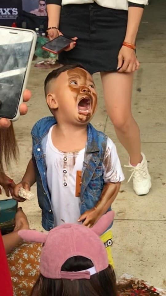 Cậu bé hoảng hốt, khóc lóc vì gương mặt lấm lem màu. Trong khi đó, những người xung quanh lại vừa bật cười vừa dùng điện thoại quay hình, chụp ảnh cậu bé. Ngay cả nam VĐV cũng luống cuống vì tình huống bất ngờ.