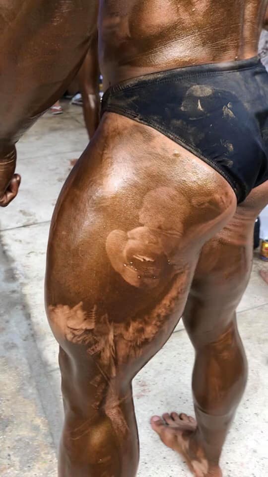 "Hậu trường giải thể hình lớn nhất Việt Nam ngày hôm qua. Người ta vừa bôi màu lên mình xong nó in nguyên cái mặt vào mông người ta luôn các bác ạ, tôi đến quỳ với thằng nhóc này luôn . Vừa tội vừa buồn cười".