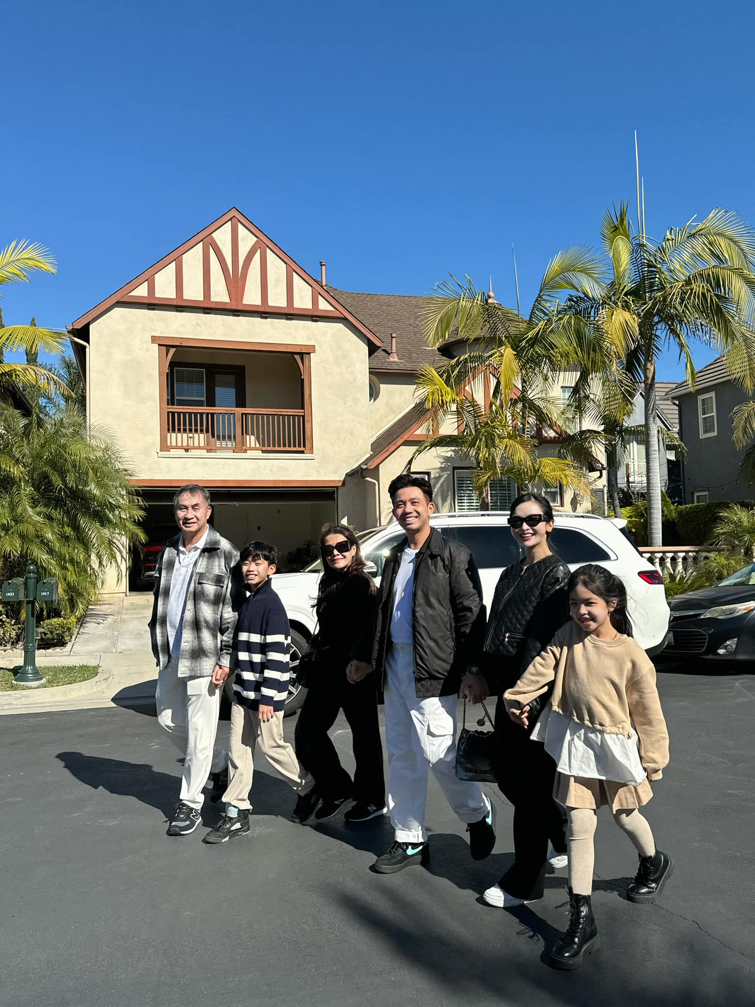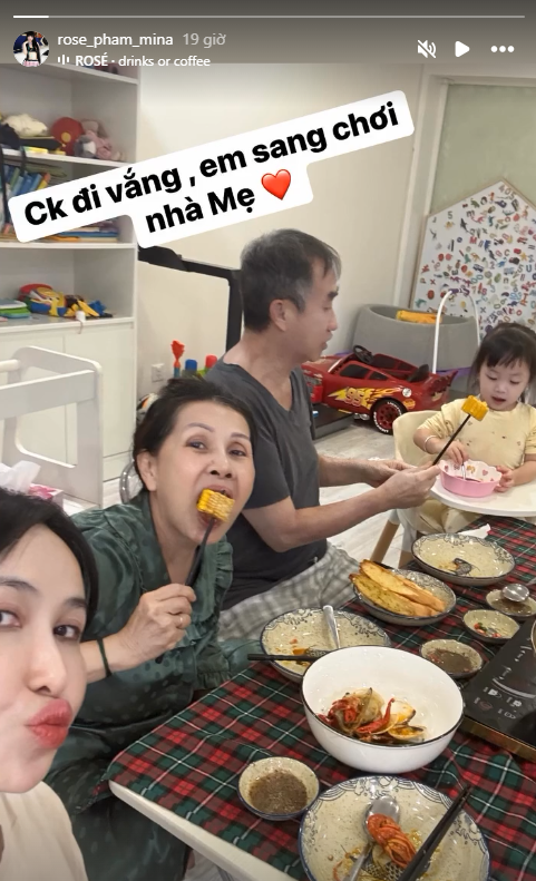 Vì Minh Nhựa đang đi Mỹ nên Mina Phạm về nhà bố mẹ chồng ăn tối. Trong hình ảnh nàng dâu hào môn chia sẻ, ông Mười mặc áo thun đơn giản, đang chăm sóc chắt nội 3 tuổi (tên là Jayla) ở bàn ăn.
