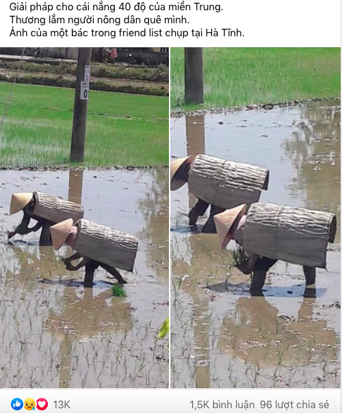 11/06/2020 16:21Hình ảnh nông dân ở miền trung mặc 'áo chống nắng' lạ để cấy lúa trên nền nhiệt 40 độ khiến nhiều người xót xa